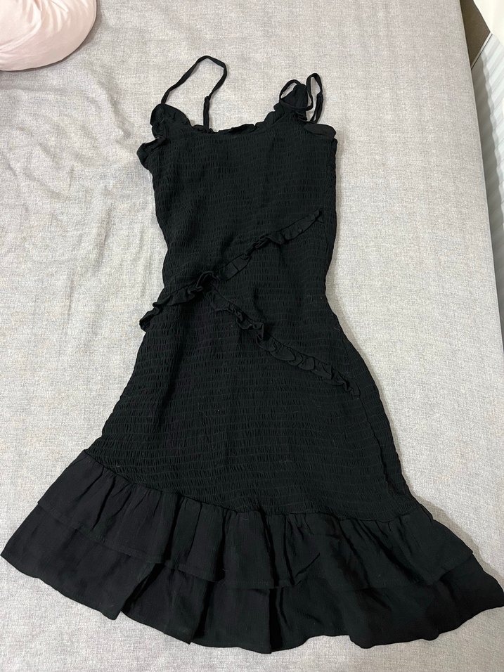Siyah, askılı ve straplez yakalı, fırfır detaylı, yumuşak keten kumaştan yapılmış dar kesim midi elbisedir. Gotik tarzda romantik akşamlar için uygundur.