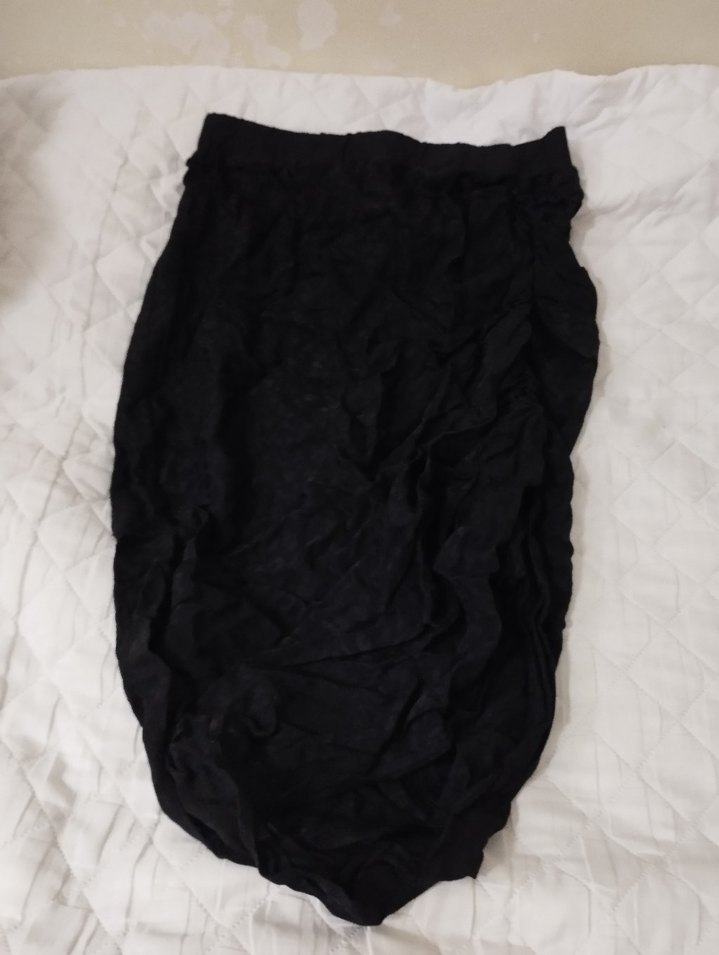 Fırfırlı detaylara sahip, siyah ve vücuda oturan midi boy etek, düz sentetik kumaştan yapılmıştır.