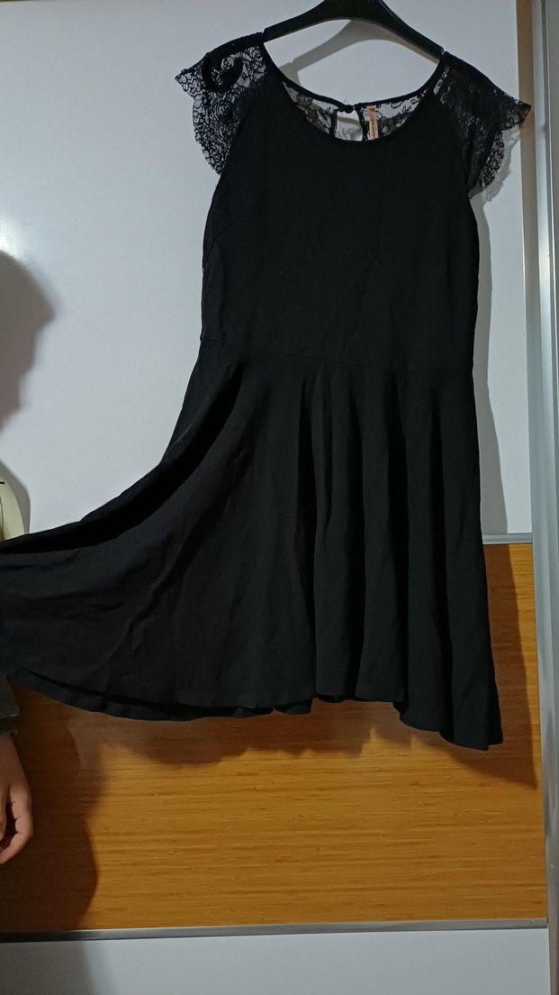 Siyah, vücuda oturan midi elbise, yuvarlak yaka ve dantel detaylı fırfırlı kolsuz tasarıma sahiptir.