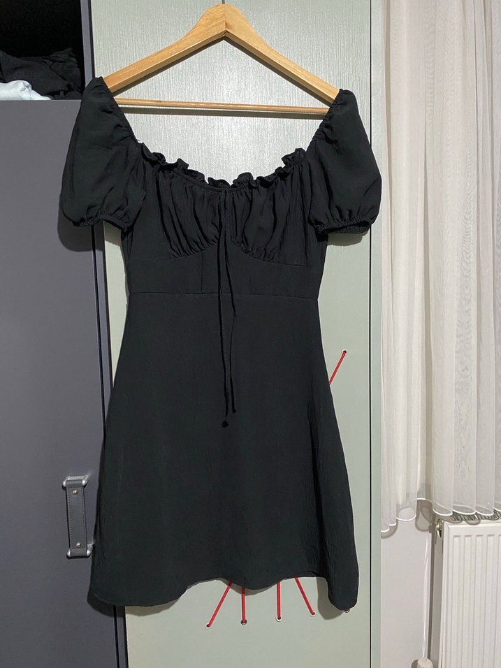 Siyah midi elbise, vücuda oturan kesimi, fırfır detayları ve askılı kısa kolları ile dikkat çeker. Teknolojik ve yumuşak kumaştan üretilmiştir.