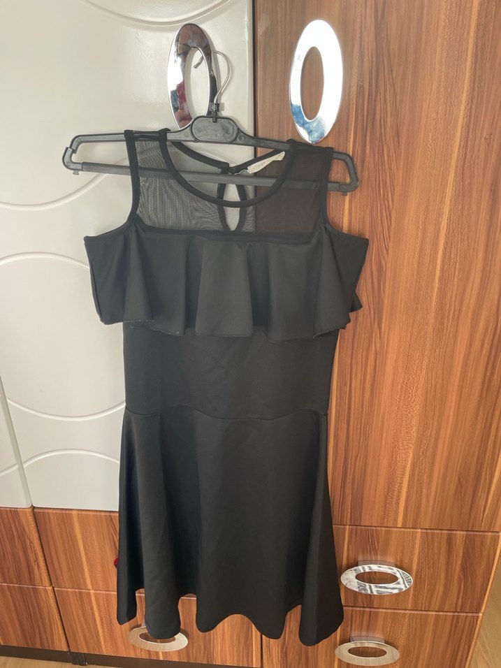 Siyah renkte, askılı, vücuda oturan midi elbise, tül detaylı üst kısmı ve fırfır süslemeleriyle gotik tarzda şık bir seçenek.