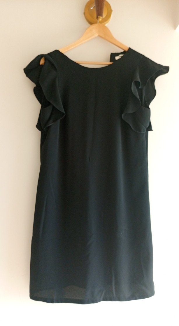 Siyah renkli, v yaka ve kolsuz, omuzlarda fırfır detaylı bol kesim midi elbise, romantik akşamlar için uygun.