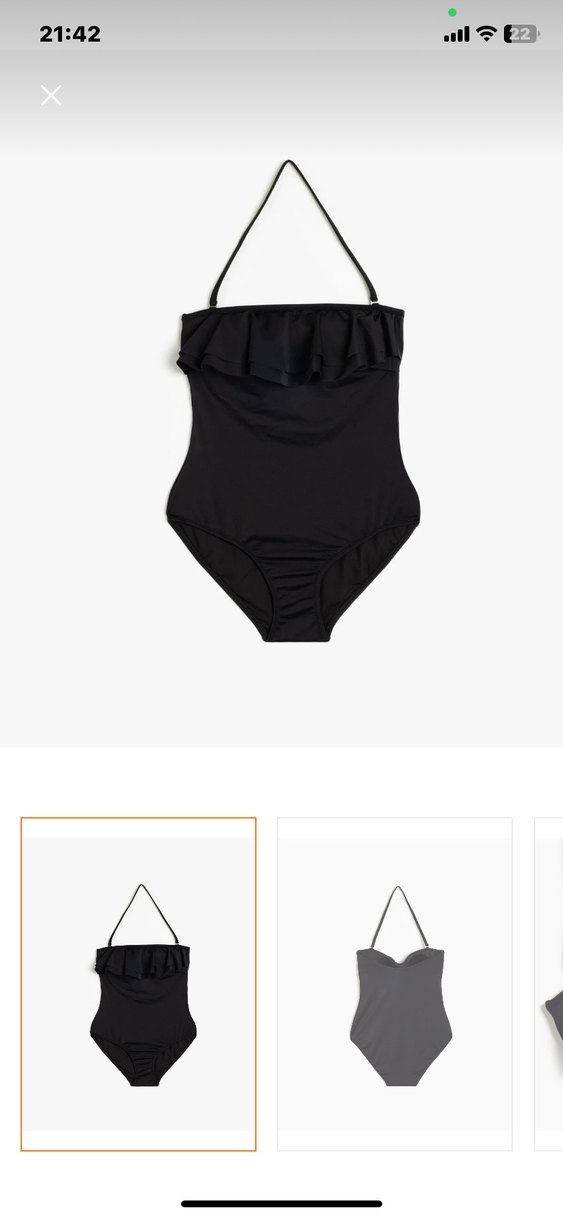 Fitted kesim, siyah renkte, fırfırlı detaylı, askılı ve midi boy kadın mayo. Minimalist goth tarzını yansıtır, plaj için uygun.