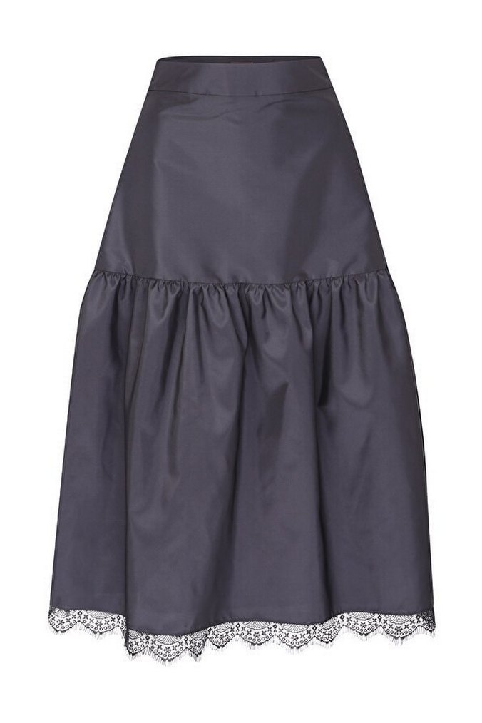 Bu Siyah midi etek, saten kumaştan, bol kesim ve fırfır detayları ile dantel uçlu olarak tasarlanmıştır. Gotik ve Paris tarzına uygundur, romantik buluşmalar için idealdir. Orijianal VAKKO
