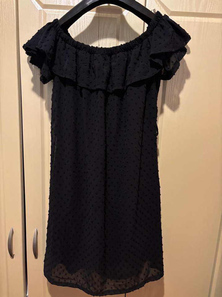 Siyah midi elbise, straplez yakalı ve fırfırlı detaylıdır. Kısa kollu, işlemeli ve bol kesimdir. Romantik akşamlar için uygundur. Kemer yeri mevcut, kemer takılarakta kullanılabilir.