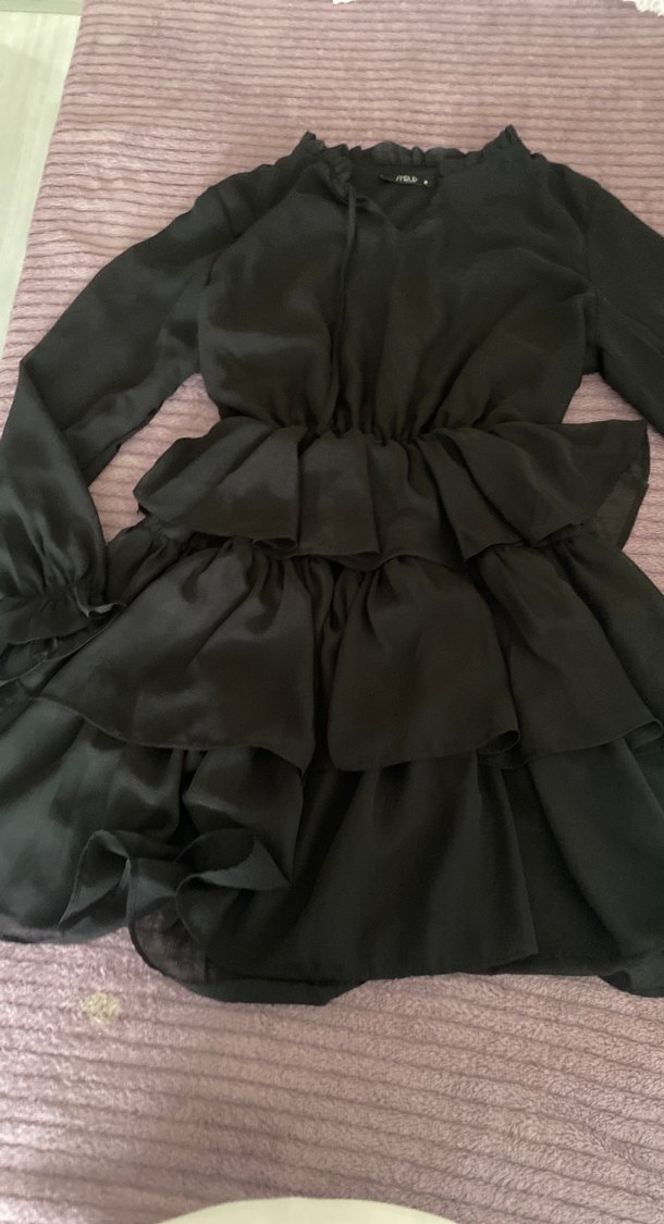 Siyah midi elbise, uzun kollu ve V yakalıdır. Fırfır detaylarıyla salaş bir kesime sahiptir. Gotik tarzda, romantik akşamlar için uygundur.