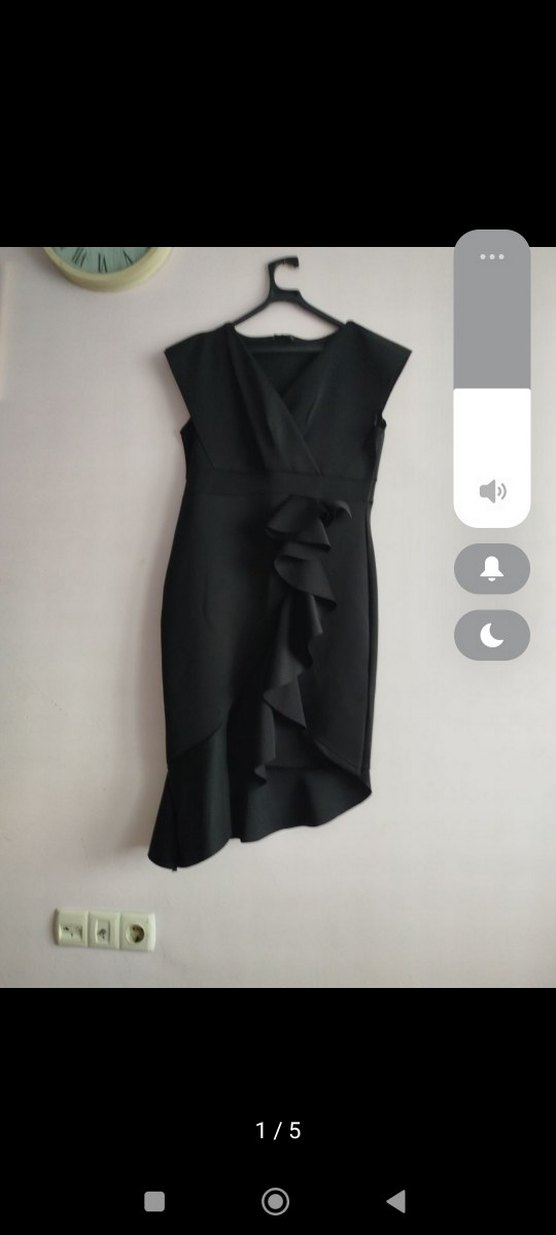 Kolsuz, v yaka, siyah midi elbise. Önde fırfır detayları ile şık ve dar kesim. Ofis için uygun, modaya uygun bir parça.
