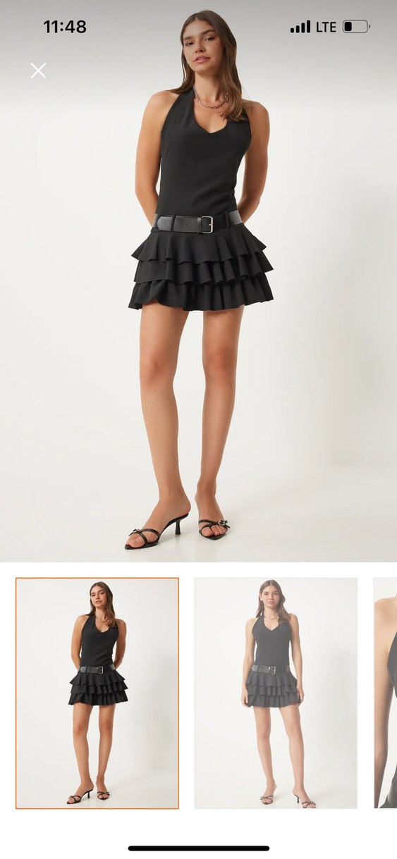 Siyah mini etek, kat kat fırfırlı ve kemer detaylıdır. Pürüzsüz sentetik kumaştan üretilmiş, cesur ve çağdaş bir görünüme sahiptir.