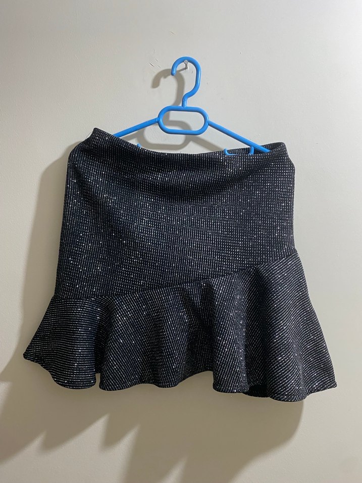 Siyah renkli sentetik kumaştan yapılmış, vücuda oturan ve fırfır detaylı mini etek.