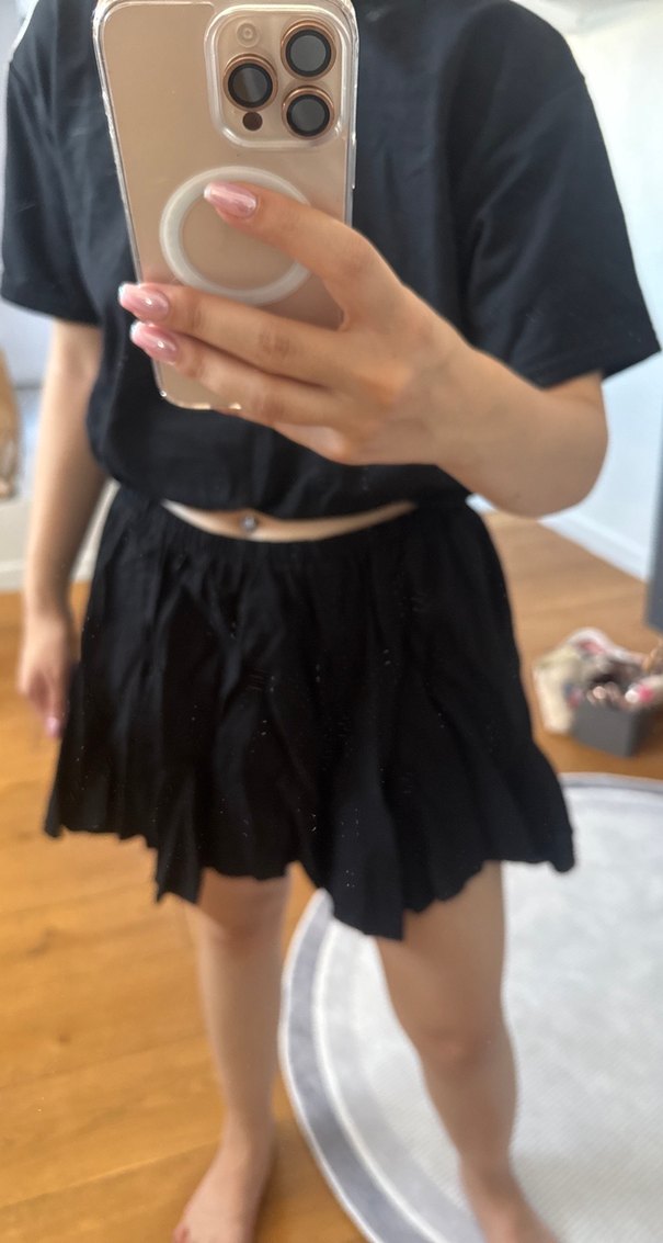 Siyah mini etek, bol kesim ve yumuşak, ipeksi kumaş üzerine fırfır detaylarıyla trendy ve günlük gotik tarz sunar.