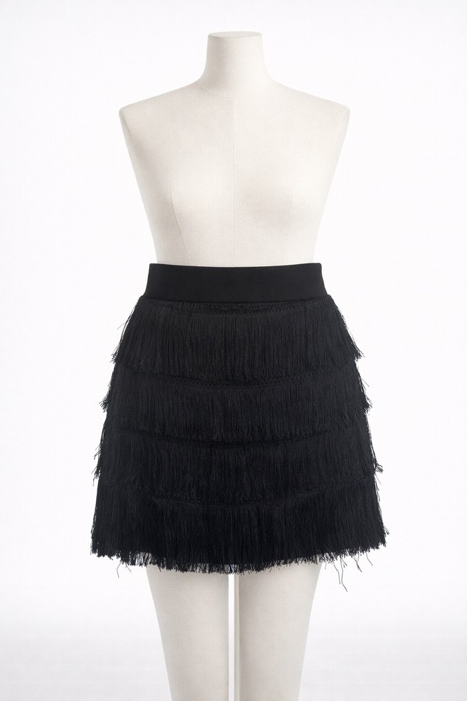 Yumuşak sentetik kumaştan, kat kat fırfırlı siyah, dar kesim mini etek, gotik ve Parisli avant-garde tarzıyla parti görünümüne uygun.