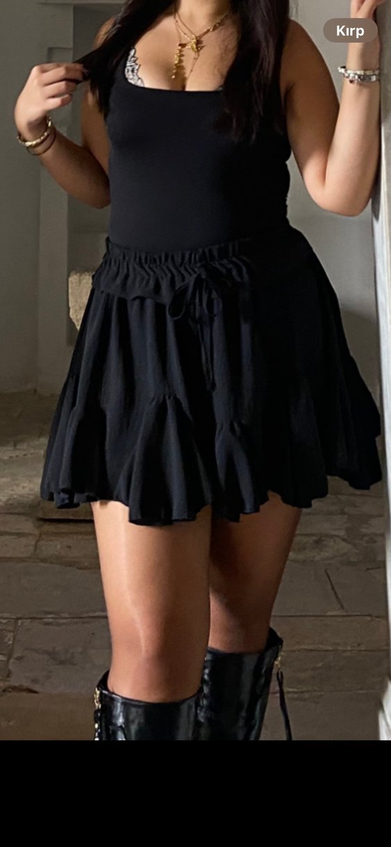 Siyah renkli, sentetik kumaştan üretilmiş, bol kesim ve fırfır detaylı etek hiçbir defosu yokturr ihtiyaç fazlası