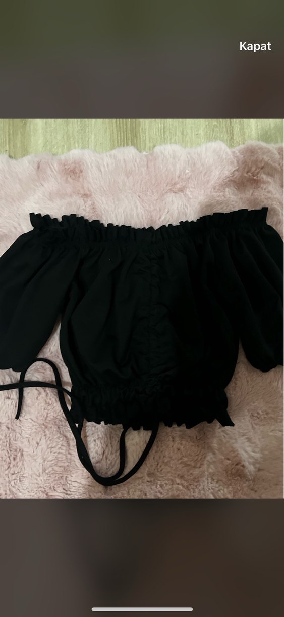 Siyah mini bluz, kayık yaka, askılı kollar ve fırfır detaylarıyla. Rahat kesimli, yumuşak sentetik kumaştan, günlük kullanıma uygun.