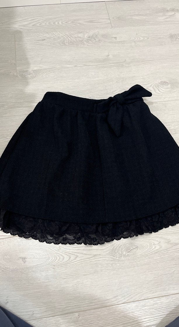 Yumuşak kumaştan, fırfır detaylı ve bol kesim siyah midi etek. Fiyonklu ve dantel süslemeli L beden uyumlu