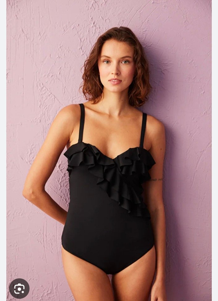 Siyah, fırfırlı detaylı, askılı, uzunlukta, fit kesim kadın mayo. Minimalist gotik tarzda, plaj için uygun.