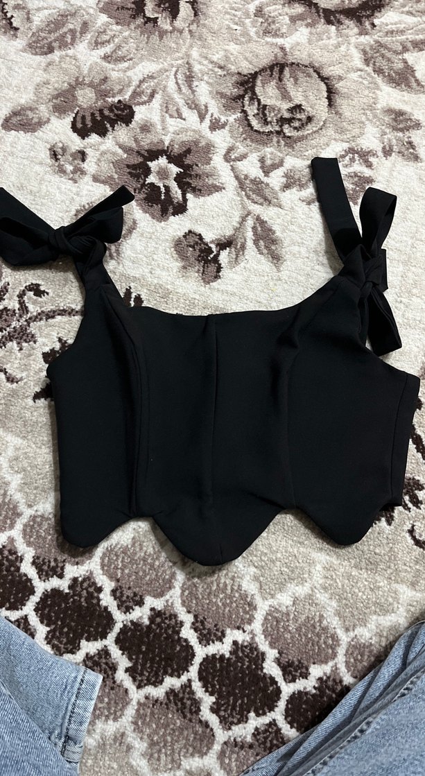 Sentetik kumaştan yapılmış, fırfırlı detaylı, bağcıklı askılı siyah bustiyer. Kısa boylu ve gotik tarzda, cesur günlük kullanım için uygundur.