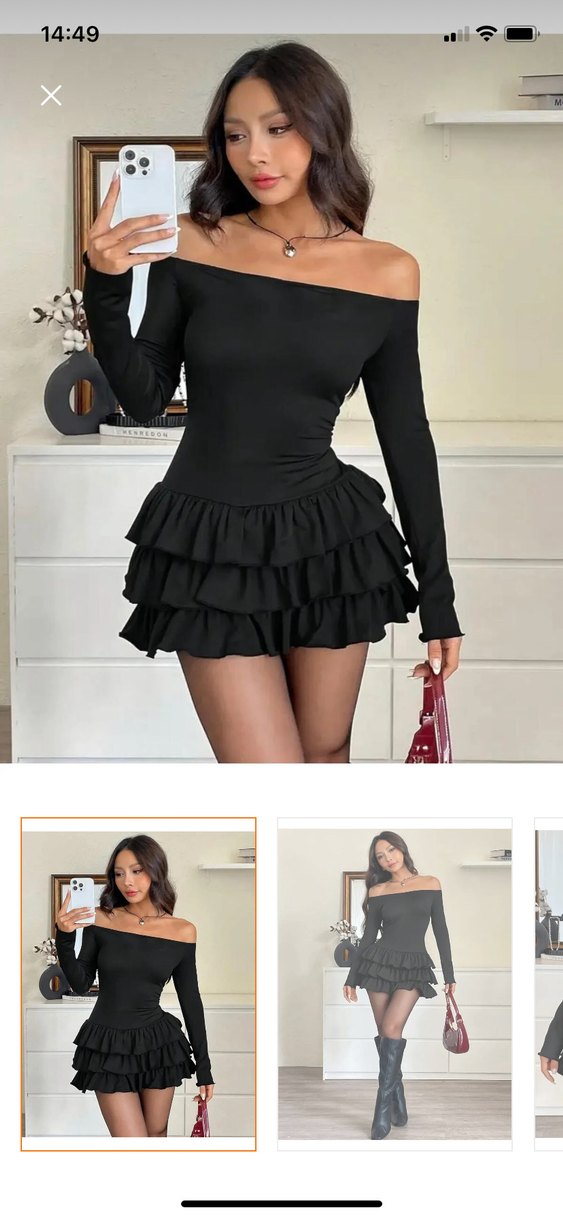 Uzun kollu ve straplez yakalı, siyah mini elbise. Kat kat fırfırlar cesur gotik tarzı yansıtıyor. Pürüzsüz sentetik kumaştan, partiye uygun.