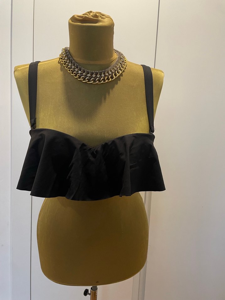 Siyah, strappy kollu ve fırfırlı detaylı bikini. Vücuda oturan, midi boy ve sentetik kumaştan üretilmiştir. Destekli a cup