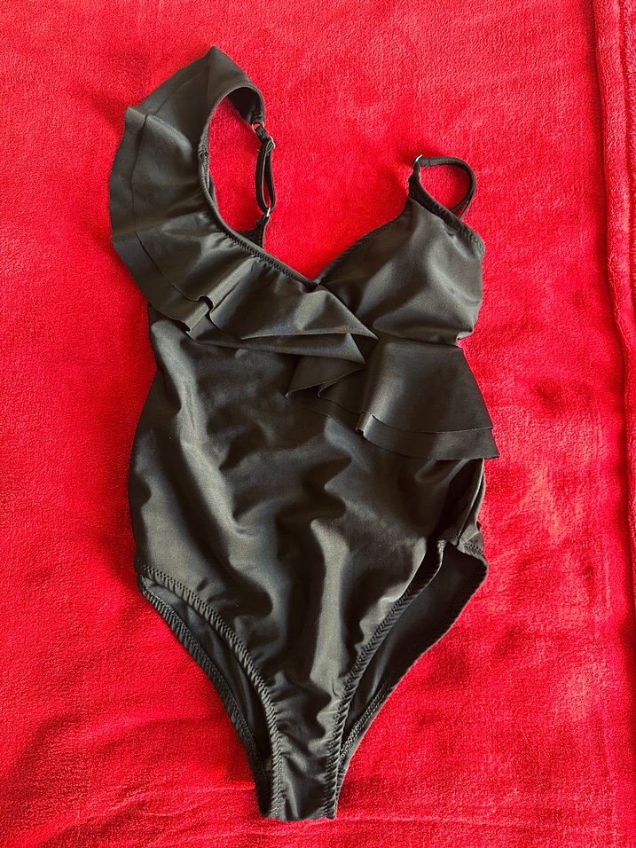 Siyah renkli, strappy askılı ve fırfırlı detaylara sahip, gotik tarzda, midi boyda ve vücuda oturan mayo.