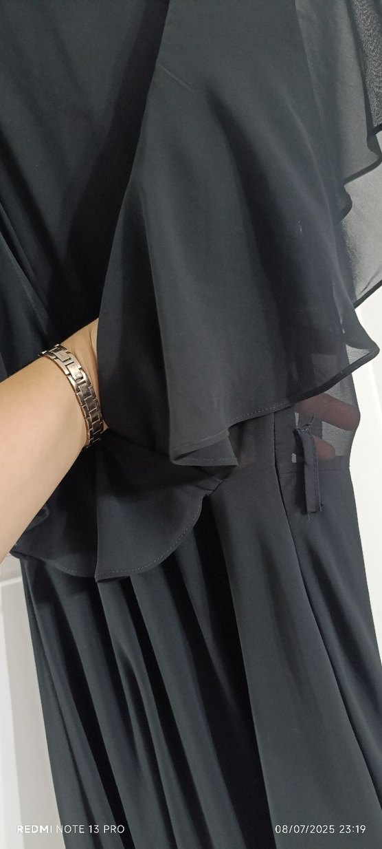 Siyah renkte, fırfırlı detaylı, askılı kollu ve V yakalı, bol kesim uzun elbise. Gotik stil, desensiz ve ofis için uygun. pazarlık vardir