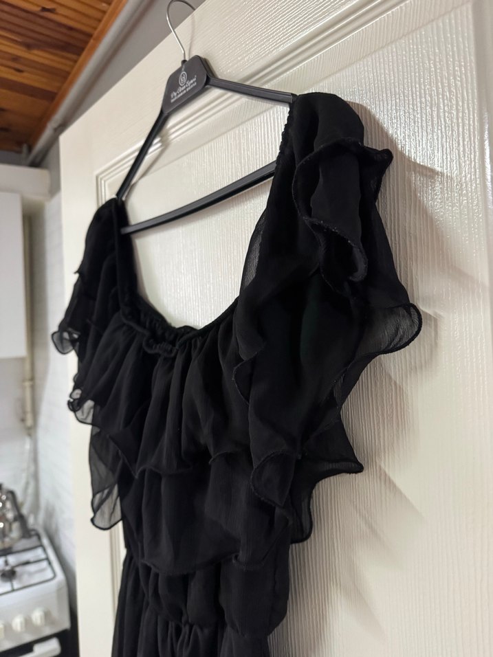 Siyah, uzun ve bol kesim olan bu gece elbisesi, kayık yaka ve fırfırlı askılı kollara sahiptir, gotik parti tarzı için uygundur.