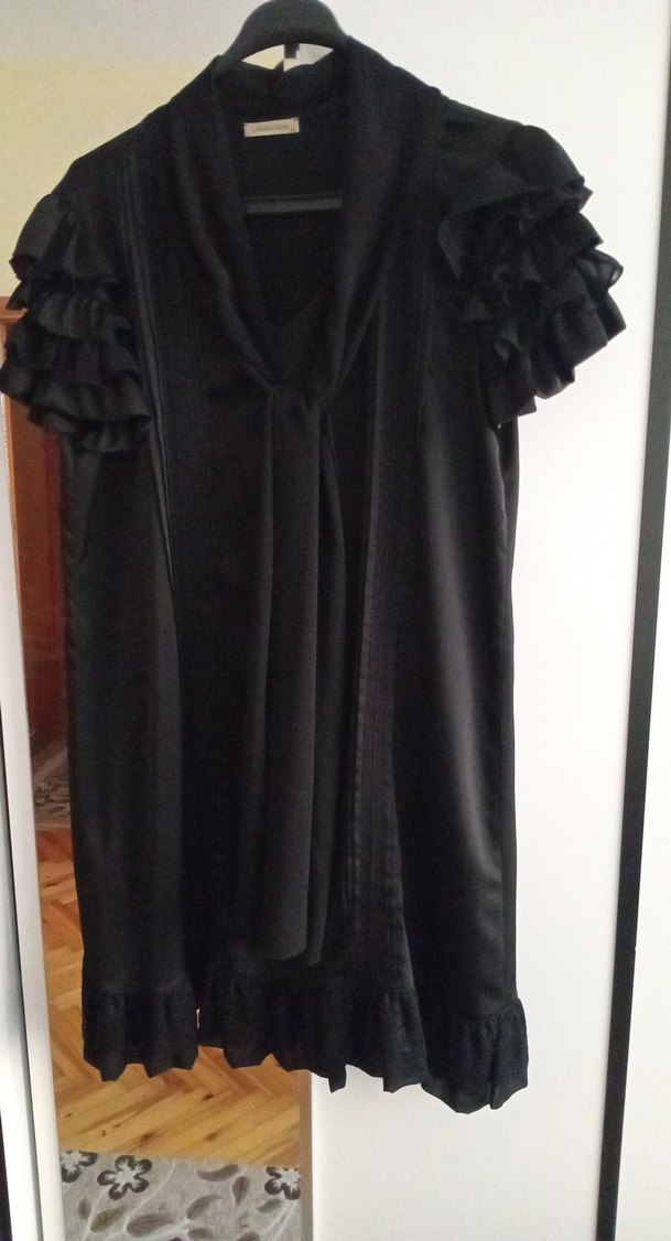 Siyah renkli, saten dokulu, V yakalı ve kolsuz hamile tuniği. Fırfır detayları kol ve etek kısmında bulunur, geniş kesimlidir.