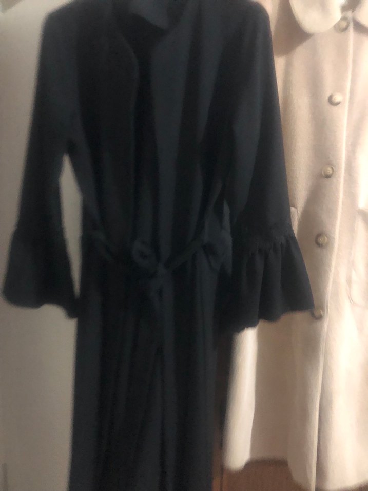 Siyah uzun elbise, notalı yaka ve fırfırlı uzun kollara sahiptir. Rahat kesim ve yumuşak sentetik kumaştan yapılmıştır. Goth ve Paris tarzını yansıtır, ofis için uygundur.
