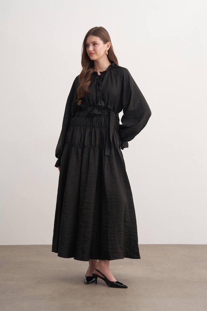 Siyah keten kumaştan, uzun kollu ve yüksek yakalı, bol kesim, fırfır detaylı uzun elbise. Desensiz, ofis kullanımı için uygundur.