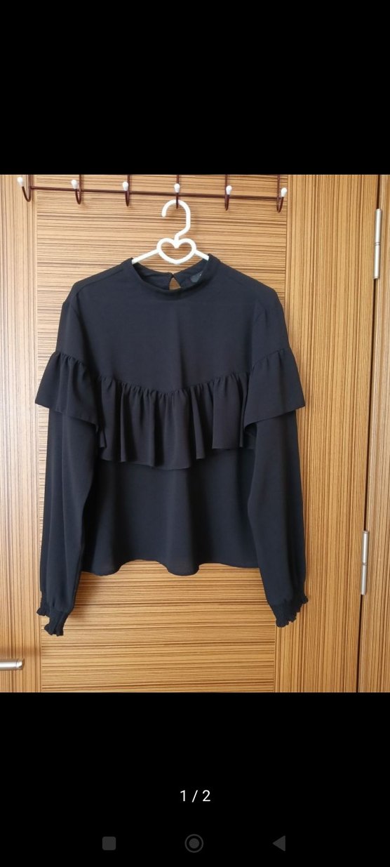Siyah, uzun kollu ve göğüs ile kollarda fırfır detaylı bluz. Yüksek yakalı ve bol kesimdir, yumuşak sentetik kumaştan üretilmiştir. Günlük sokak stili için uygundur.