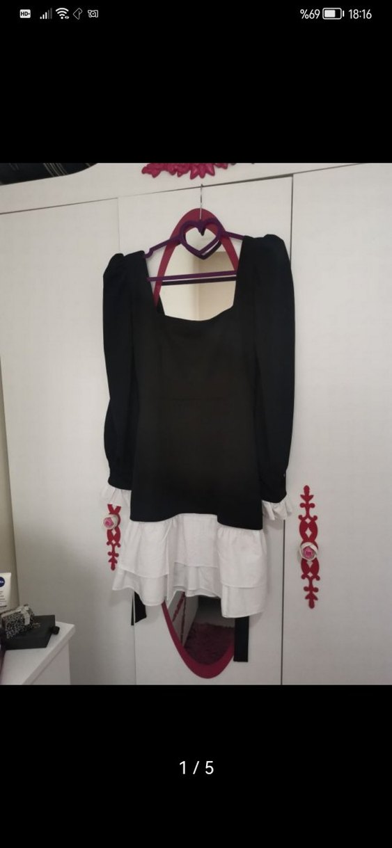 Siyah, uzun kollu, straplez yakalı ve fırfırlı detaylara sahip, vücuda oturan midi uzunluğunda gotik tarz elbise. Sentetik kumaştan üretilmiştir ve günlük kullanıma uygundur.