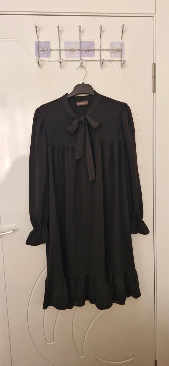 Siyah midi elbise, uzun kollu ve bol kesimdir. Fırfırlı manşet ve etek ucu detayları ile yüksek yakada fiyonk bulunur. İpek gibi dokulu klasik şıklık sunar.