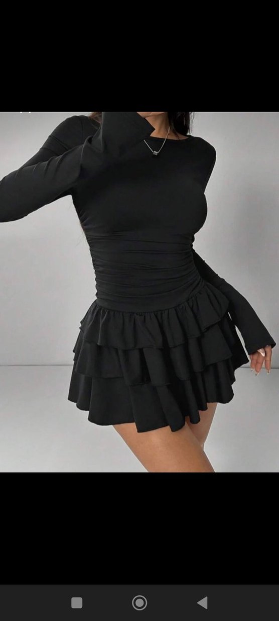 Siyah, uzun kollu, yüksek yakalı, vücuda oturan mini elbise. Kat kat fırfır detaylarıyla gotik tarza uygun, parti için ideal. hiç giyilmemiş kartı üstünde