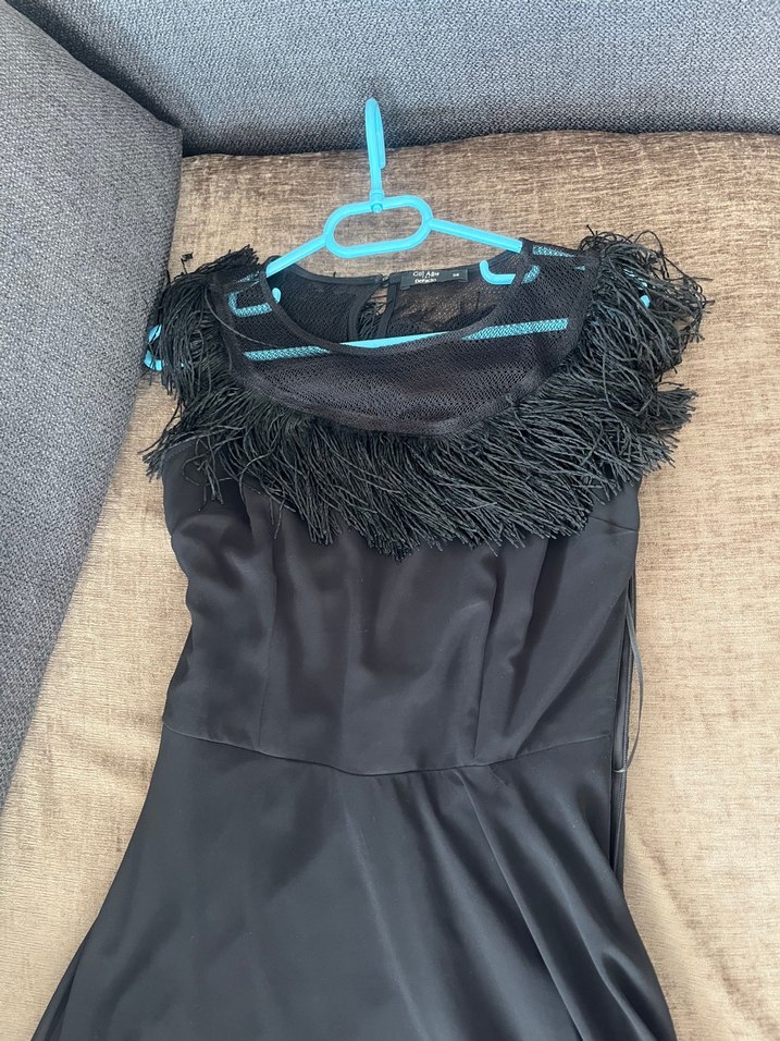 Siyah, kolsuz, ve fırfır detaylı, vücuda oturan yan tarafında fermuarlı elbise . Alt tarafı tül iç kısımı diz hizasındadır boya göre değişiklik göstere bilir .İki kez giyilmiş temizdir hiç bir kusuru yoktur . Defacto Gül Ağış elbisesi 38 bedendir.
