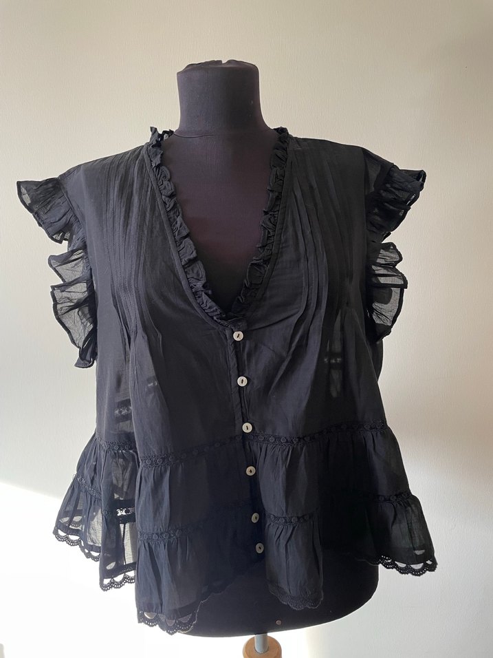 Siyah keten bluz, V yaka ve fırfırlı kolsuz tasarıma sahip. Nakış detayları ve bol kesim, günlük kullanıma uygun. Kol altından eni 59 cm boy 52 cm