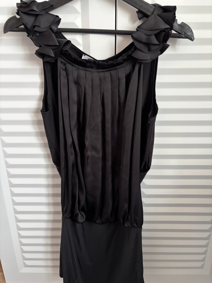 Siyah, v yaka ve fırfırlı askılara sahip, dar kesim midi elbise. Düz ve desen içermeyen tasarımıyla ofis için uygun, gotik tarzda.s/m