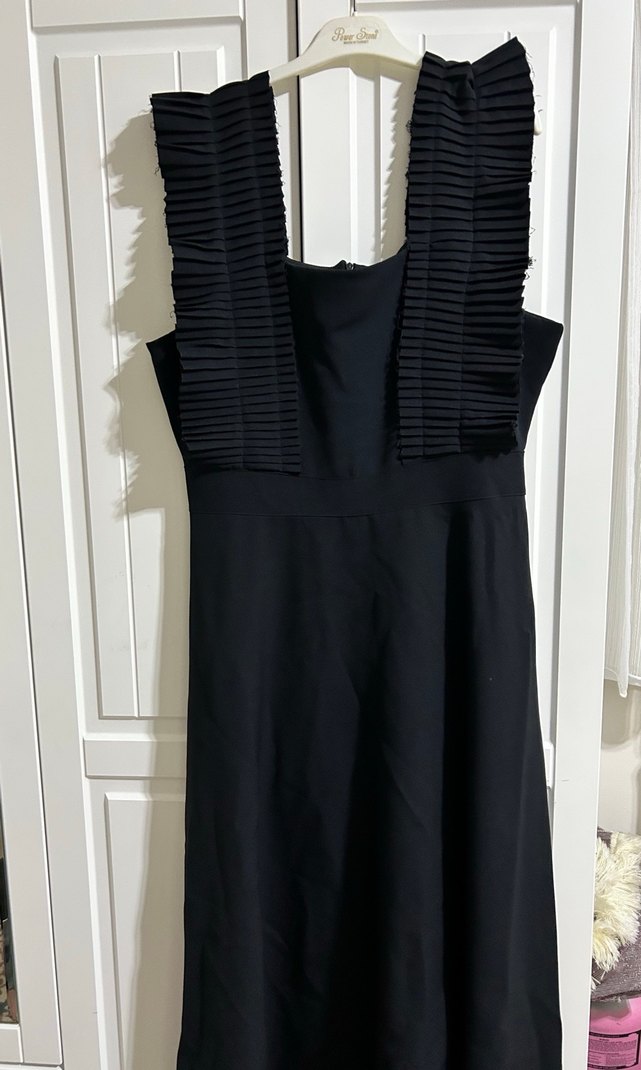 V yakalı, kolsuz, fırfırlı detaylı, siyah uzun abiye elbise. Gotik ve şık tarzı ile ofis etkinlikleri için uygundur.