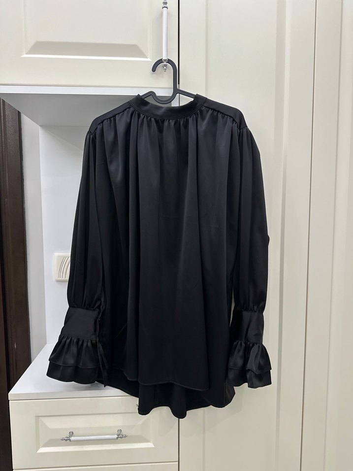 Uzun kollu, yüksek yakalı, fırfırlı manşet detaylı siyah saten bluz. Salaş kesim yalnızca 1 kez kullanıldı. Seyyar kuşağı mevcut .