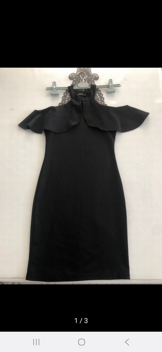 Bu siyah, vücuda oturan uzun elbise, yüksek yakası ve kolsuz fırfır detaylarıyla gotik ve zarif bir görünüm sunar, ofis için uygundur.