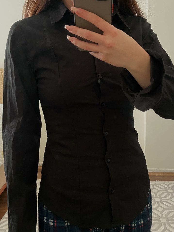 Siyah düğmeli keten gömlek, yakalı ve uzun kollu, fit kesimiyle ofis için trend gotik tarzda rahat bir seçim.