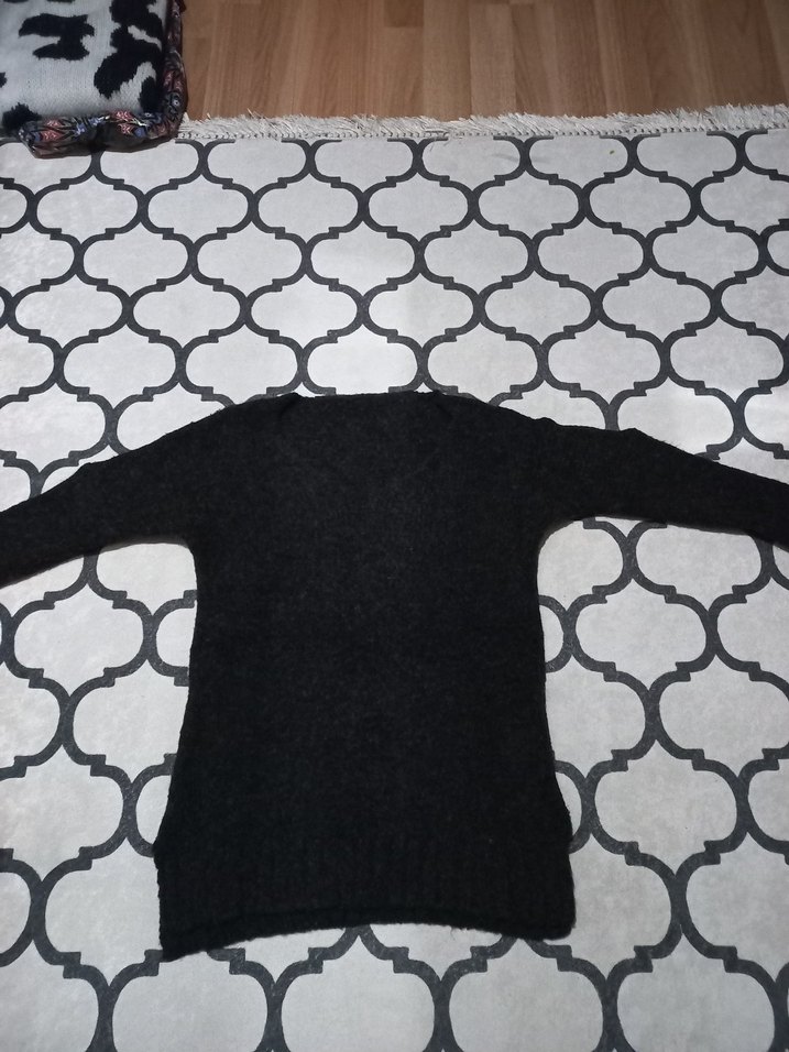 Bu siyah fitilli triko kazak, V yaka ve uzun kolludur. Günlük kullanım için rahat ve şık bir görünüm sunar. Desensiz tasarımıyla trend belirleyicilere uygundur. tayt üzeri için çok güzel bir ürün