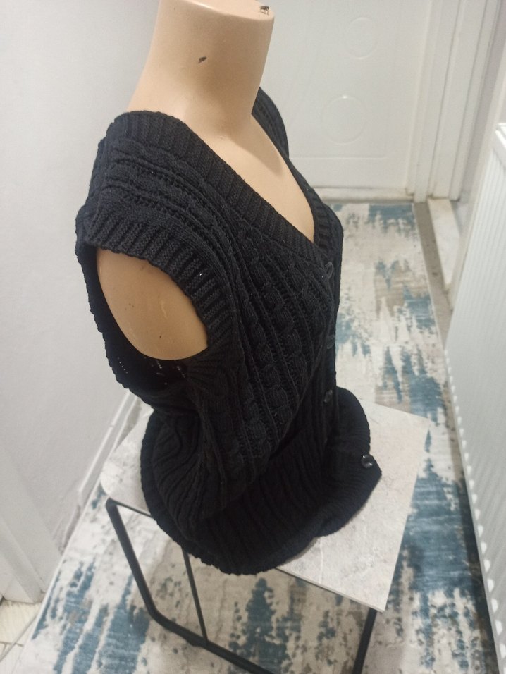 Siyah renkte, fit kesim ve yüksek yakalı kolsuz triko süveter. Kısa boyu ve rahat örgü yapısıyla günlük kullanım için uygundur. yelek örgü sıfır ürün hiç kullanılmadı aynı gün kargoya verilir