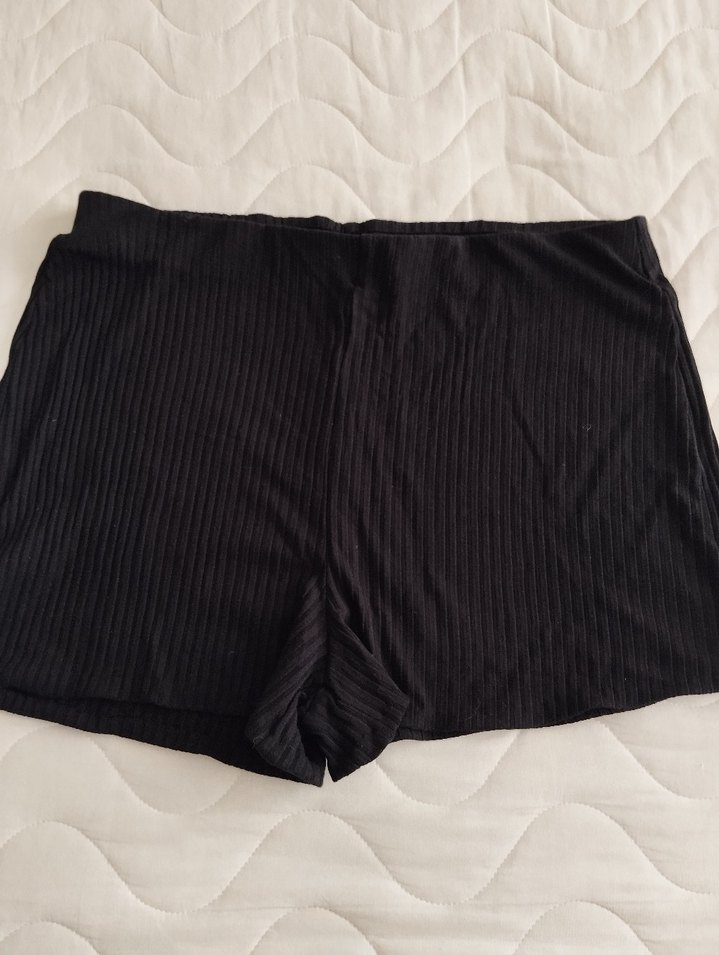 Siyah, fitilli ve pileli dokusu olan mini hamile şortu. Kısa boy, günlük kullanıma uygun rahat sokak stili.