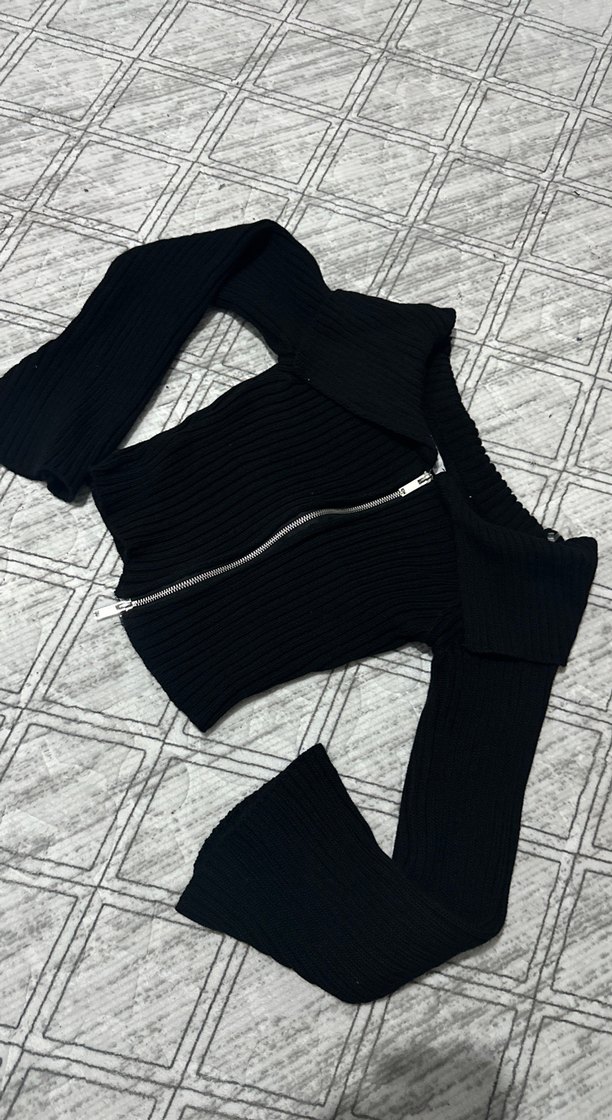 Siyah renkli, fitilli örgü kumaştan yapılmış, uzun kollu ve kısa kesim bir kazak. Önünde fermuar bulunur, trend sokak stili için uygundur.