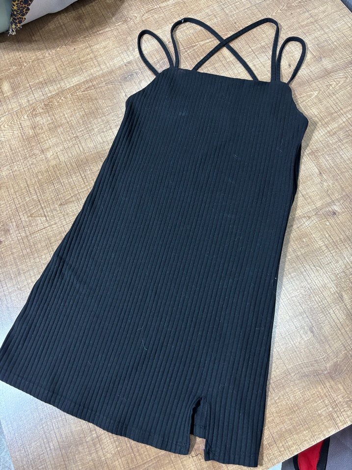 Siyah fitilli triko elbise, askılı ve yüksek yakalıdır. Pilili dokusu ve midi boyu günlük kullanım için uygundur.