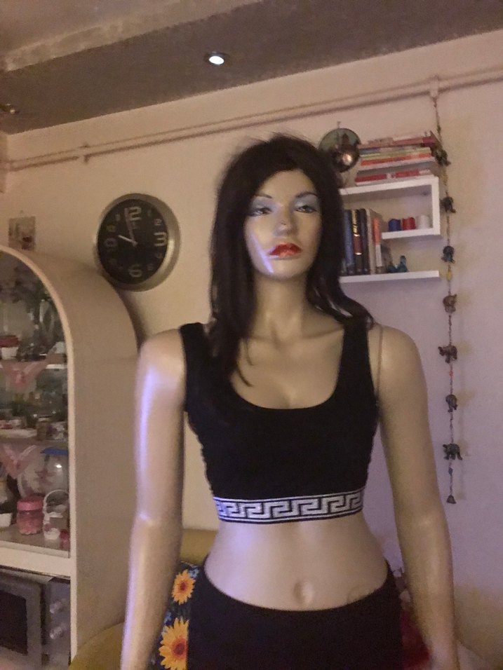 Siyah, düz kesim, ince askılı ve düz yakalı, desenli lastik detaylı fitilli crop top. Sentetik kumaştan üretilmiştir.