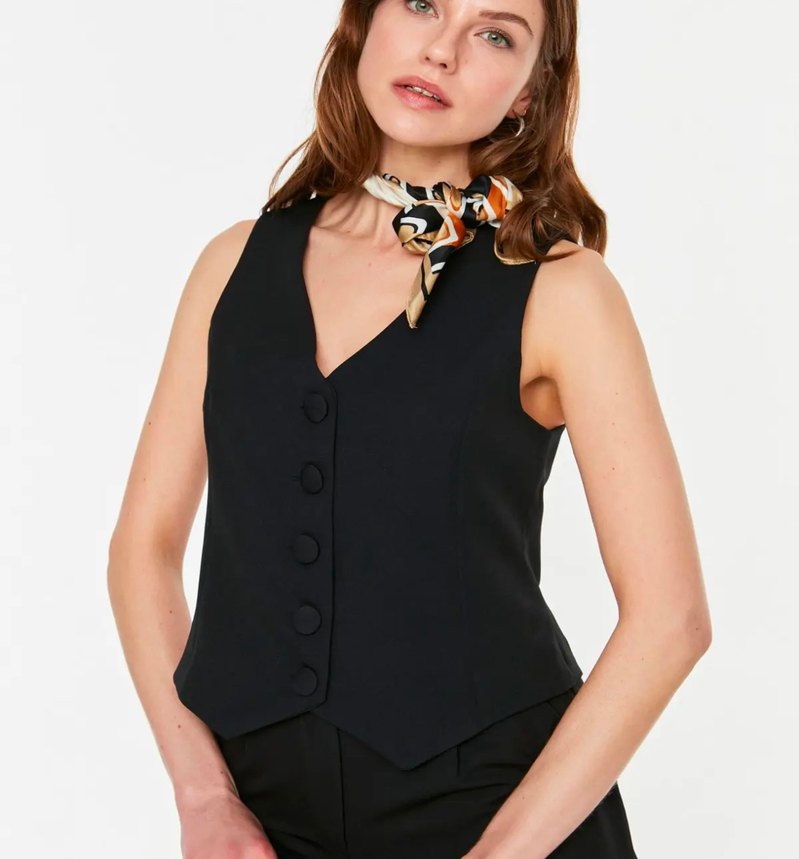 Siyah Fitted düğmeli , Crop dokuma , V Yakalı Kadın Yelek
