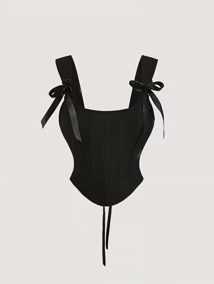 Sentetik kumaştan yapılmış, fiyonk detaylı, halter yakalı ve askılı siyah, vücuda oturan gotik tarzda kısa büstiyer.