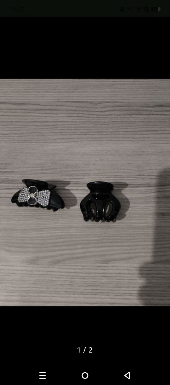 Siyah plastikten yapılmış, minimal gotik tarzda iki adet saç tokası. Birinde fiyonk detay bulunur.