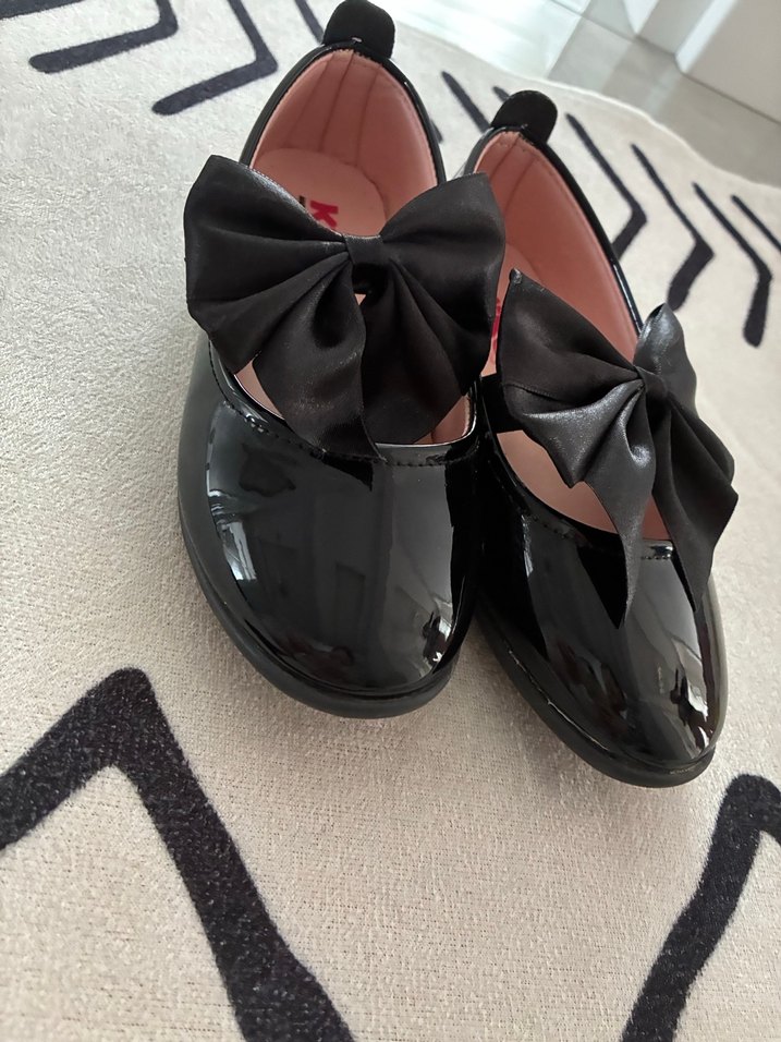 Siyah, fiyonk detaylı kız çocuk babetleri parlak yüzeye sahip kauçuk malzemeden yapılmıştır. 1 kere giyildi.