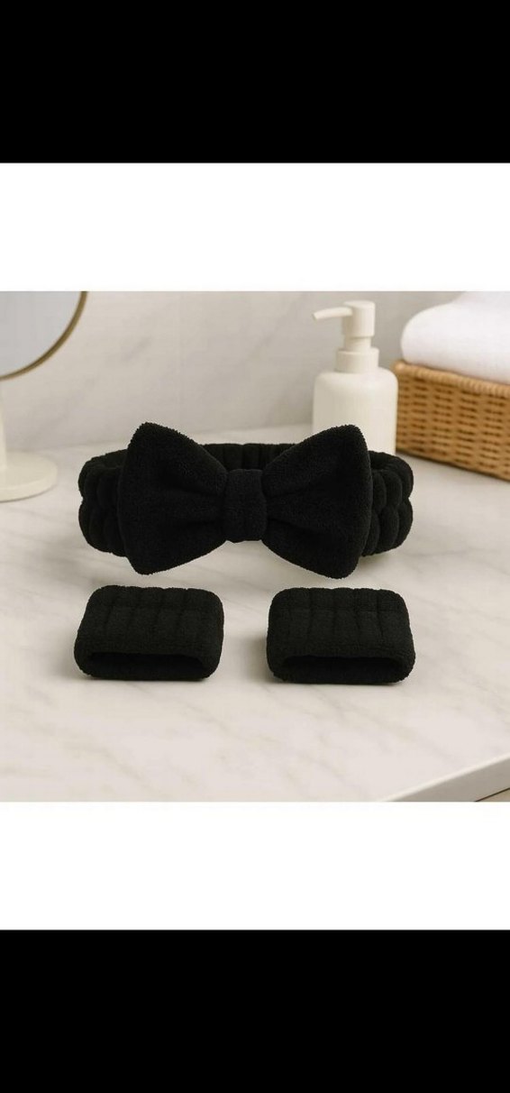 Yumuşak kumaştan yapılmış siyah fiyonk detaylı saç bandı ve uyumlu bileklik rahat tarz için uygundur. Suyu emici özelliğe sahip bilekliği yüzünüzü yıkarken suyun dirseklerinize akmasını engeller